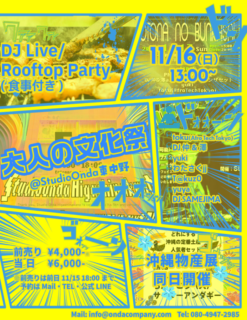 / ブログ / By StudioOnda東中野 今年もやります!ビル一棟まるまる遊べる大人の文化祭!! DJの音楽を楽しみながらお酒片手に食事も楽しめる! ちょっと疲れたらスタジオでごろんとできる。 今年は沖縄物産展も …
